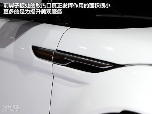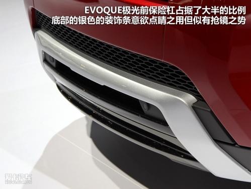 EVOQUE極光前進氣格柵之下前保險杠占據(jù)了大半的比例,底部的銀色的裝飾條意欲點睛之用,但似有搶鏡之勢,發(fā)動機艙蓋上的進氣口尚不知其效用究竟有多大,想必美觀之用是其最大的作用吧。
