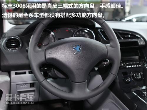 標志3008采用的是真皮三幅式的方向盤,手感頗佳。遺憾的是全系車型都沒有搭配多功能方向盤,而這些多功能的按鍵也只能在中控臺上才能找到。