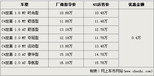 C4世嘉是東風(fēng)雪鐵龍于2008年7月28日發(fā)布的去年第二款新車(chē),廠商指導(dǎo)價(jià)為10.88萬(wàn)-16.88萬(wàn)元。今年的4月6日,東風(fēng)雪鐵龍又為C4世嘉添加了2.0L手動(dòng)奪冠版車(chē)型,致使C4世嘉車(chē)型增加到了7款。近日根據(jù)網(wǎng)上車(chē)市價(jià)格監(jiān)測(cè)系統(tǒng)顯示,C4世嘉目前全系優(yōu)惠4000元,具體車(chē)型售價(jià)見(jiàn)下表: