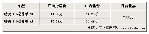 雖然明銳1.6逸尊版僅上市1天,但經(jīng)銷商已經(jīng)放出7000元的現(xiàn)金優(yōu)惠,如果希望店內(nèi)送裝飾,可優(yōu)惠現(xiàn)金6000元。但目前現(xiàn)車較緊張,需要訂車,訂車最快也需要20天左右,如果訂購(gòu)車輛顏色較少,需等一個(gè)半月時(shí)間,定金為5000元。