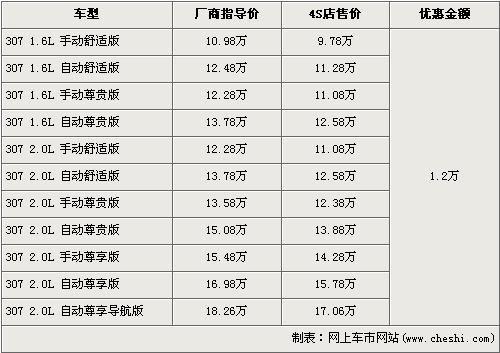 2007年9月22日,全新一代的東風(fēng)標(biāo)致307在眾多消費者的熱切期盼中新悅登場。新東風(fēng)標(biāo)致307全系多達九種顏色共十三款車型,價格從10.98萬元--16.58萬元。近日根據(jù)網(wǎng)上車市價格監(jiān)測系統(tǒng)顯示,現(xiàn)在三廂標(biāo)致307全系優(yōu)惠1.2萬元,具體車型以及價格如下: