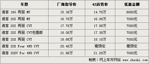 逍客是在國內(nèi)上市的第一款真正意義上的跨界車,它同時(shí)也是日產(chǎn)歐洲設(shè)計(jì)中心成立之后開發(fā)的第一款新車,既擁有SUV的時(shí)尚外觀和越野性,又有轎車的舒適性和省油優(yōu)勢(shì)。根據(jù)網(wǎng)上車市價(jià)格監(jiān)測(cè)系統(tǒng)顯示,目前逍客全系最高優(yōu)惠7000元,具體車型以及價(jià)格如下: