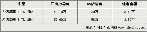 吉普大切諾基是吉普家族中極具個(gè)性的一款大尺寸車型,在推出3.7L排量車型后,消費(fèi)者的選擇空間更大,同時(shí)帶給駕乘者完全不同的駕駛體驗(yàn)。根據(jù)網(wǎng)上車市價(jià)格監(jiān)測系統(tǒng)顯示,目前大切諾基的售價(jià)最高優(yōu)惠3.69萬元,具體車型以及價(jià)格如下: