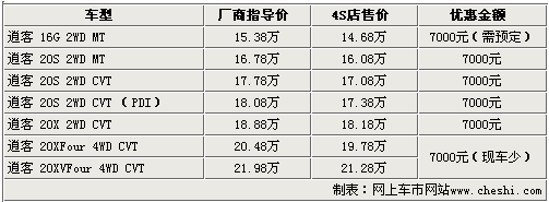 東風(fēng)日產(chǎn)推出的逍客車型是在國內(nèi)第一款真正意義上的跨界車,這款車既擁有SUV的時尚外觀和通過性,又有轎車的舒適性和省油優(yōu)勢。根據(jù)網(wǎng)上車市價格監(jiān)測系統(tǒng)顯示,目前在北京地區(qū)購買逍客的消費(fèi)者,可以享受到全系7000元的現(xiàn)金優(yōu)惠,但是1.6L車型需預(yù)定。具體車型以及價格如下: