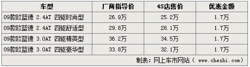 歐藍(lán)德是三菱汽車第一款采用轎車底盤形式生產(chǎn)的SUV,沿用了三菱Lancer(藍(lán)瑟)轎車的平臺(tái),具有轎車乘坐的舒適性,同時(shí)它又有SUV的特性。根據(jù)網(wǎng)上車市價(jià)格檢測(cè)系統(tǒng)顯示,目前歐藍(lán)德車型主要為09款車型,最高讓利達(dá)1.7萬元。具體車型以及價(jià)格如下: