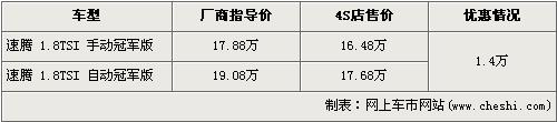 速騰冠軍版可以說是一汽大眾繼老款寶來后,又一款可以稱得上是“駕駛員之車”的車型。出自大眾先進(jìn)的PQ35平臺(tái),再加上配備缸內(nèi)直噴的1.8TSI發(fā)動(dòng)機(jī),更寬的輪胎這一切的“與眾不同”使得速騰冠軍版收到了許多膜拜性能的消費(fèi)者的喜愛。據(jù)了解,速騰1.8TSI出現(xiàn)了1.4萬元的優(yōu)惠,具體價(jià)格詳情請(qǐng)看下表: