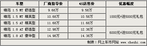 廣汽本田鋒范自上市以來,以全新的造型得到了消費(fèi)者的極大關(guān)注,隨著同級別競爭車型的不斷推出,鋒范在價(jià)格上也出現(xiàn)了松動(dòng),其中1.8L最高優(yōu)惠幅度達(dá)到了6000元,同時(shí)還有購車送禮的活動(dòng)推出,具體行情如下:
