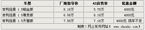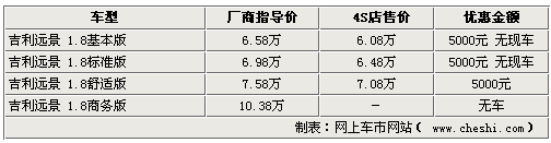 作為一款上市時間較長的車型,吉利遠(yuǎn)景系列近期也開始加大優(yōu)惠幅度促銷。網(wǎng)上車市網(wǎng)站近日由經(jīng)銷商處了解到,現(xiàn)在購買遠(yuǎn)景車型,將享受到最高5000元的現(xiàn)金優(yōu)惠,不過各家4S店內(nèi)的車型并不齊全,部分車型仍處于無車的狀態(tài)。具體詳情如下: