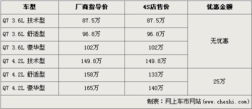 據經銷商銷售人員介紹,在售的奧迪Q7已經全部停產,并且店內3.6L車型已經沒有現車,并且也無法預訂。4.2L車型除了舒適版和豪華版外也均無現車。經25萬元優(yōu)惠后,奧迪Q7 4.2L舒適版售價從158萬元下降到了133萬元,4.2L豪華版售價也從165萬元下降到了140萬元。如果有想入手Q7的消費者,現在是一個不錯的好時機。