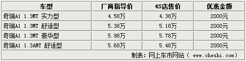 09款奇瑞A1系列在老款車型的基礎上增加了實力型和AMT兩種新車型,同時舒適型和豪華型官方降價4000元,售價已進入五萬元以內。網(wǎng)上車市網(wǎng)站近日了解到,各家4S店內的新車價格有所變化,全系車型均可小幅優(yōu)惠2000元。詳情如下: