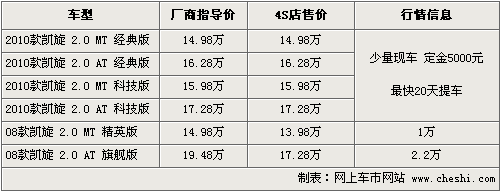9月初,東風(fēng)雪鐵龍推出了2010款凱旋,全新車型配備了大家期待已久的天窗,同時也提升了其他方面的配置,為消費(fèi)者提供了非常廣闊的選擇空間。根據(jù)網(wǎng)上車市價格監(jiān)測系統(tǒng)顯示,目前新款車型有少量現(xiàn)車,部分車型需預(yù)訂,老款最高優(yōu)惠2.2萬元。詳細(xì)車型價格如下: