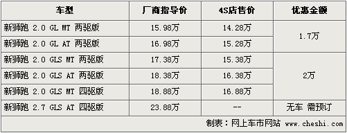 東風(fēng)悅達(dá)起亞獅跑和北京現(xiàn)代途勝屬于同平臺車型,但相比途勝,獅跑外觀更有活力。現(xiàn)售的09款獅跑,時尚的外觀和改款后配置的重新升級,使獅跑在同級別中的性價比進(jìn)一步提升。根據(jù)網(wǎng)上車市價格監(jiān)測系統(tǒng)顯示,目前獅跑最高優(yōu)惠現(xiàn)金2萬元,具體行情如下: