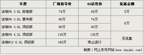 途銳是大眾首款引進我國的SUV車型,在3.6L及4.2L率先上市后,大眾為了滿足消費者的更大胃口,緊接著又推出了搭載12缸發(fā)動機的6.0L車型。隨著大排量消費稅的頒布,給9月份后入關的大排量車型帶來了一次不小的沖擊,令大排量汽車價格都上調(diào)了不少。近日據(jù)網(wǎng)上車市價格系統(tǒng)監(jiān)測顯示,大眾途銳的6.0L車型已經(jīng)停止進口,并且購買目前購車可以得到最高6萬元的優(yōu)惠,具體詳情請看下表: