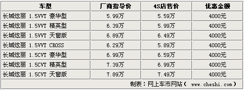 本次長(zhǎng)城炫麗首先由廠家開(kāi)始優(yōu)惠,全系車(chē)型中1.3L兩款車(chē)型官降4000元,其他車(chē)型均降3000元。而經(jīng)銷(xiāo)商處則可在廠家官降的基礎(chǔ)上再給出千元的優(yōu)惠。