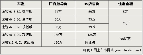 途銳是大眾首款引進(jìn)我國的SUV車型,在3.6L及4.2L率先上市后,大眾為了滿足消費(fèi)者的更大胃口,緊接著又推出了搭載12缸發(fā)動(dòng)機(jī)的6.0L車型。隨著大排量消費(fèi)稅的頒布,給9月份后入關(guān)的大排量車型帶來了一次不小的沖擊,令大排量汽車價(jià)格都上調(diào)了不少。近日據(jù)網(wǎng)上車市價(jià)格系統(tǒng)監(jiān)測(cè)顯示,大眾途銳的6.0L車型已經(jīng)停止進(jìn)口,并且購買目前購車可以得到最高7萬元的優(yōu)惠,具體詳情請(qǐng)看下表: