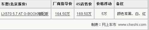 如果提到豪華SUV,大家一定首先想到寶馬X6、奔馳GL、保時捷卡宴以及路虎攬勝等豪華SUV中的“大佬”們,作為國際知名越野極強悍的汽車品牌,雷克薩斯的每一款車型都可謂經(jīng)典,而雷克薩斯LX570又重新詮釋了豪華SUV的新尺度,與上一代的LX470相比,你卻不得不承認雷克薩斯的LX系列正在以跨越的方式完成自己的進化。近日,近日根據(jù)網(wǎng)上車市價格檢測系統(tǒng)顯示,目前雷克薩斯豪華SUV-LX570加價較上段時間的10萬元較少了一半,僅加價5萬進行銷售,而且有現(xiàn)車供應(yīng),具體情況請參照下表:
