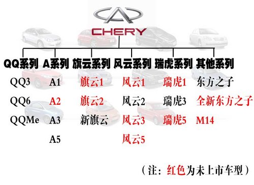 另外,奇瑞汽車銷售有限公司副總經(jīng)理劉宏偉先生還介紹了奇瑞品牌新產(chǎn)品規(guī)劃,未來將會(huì)有10款新車型推出。剛剛上市的風(fēng)云2三廂是風(fēng)云系列的首款車型,未來還會(huì)推出風(fēng)云1、風(fēng)云3和風(fēng)云5,分別為A00級(jí)、A級(jí)和B級(jí)車型。而旗云系列除了會(huì)推出旗云1以外,還會(huì)推出旗云2;瑞虎在今年年底將推出DR該款,未來還會(huì)推出瑞虎1和瑞虎5;另外,新一代東方之子和代號(hào)為B14的硬頂敞篷跑車也被列入新車規(guī)劃之中。