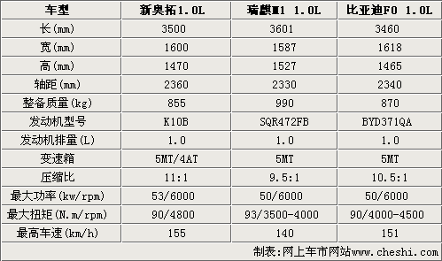 新奧拓、瑞麒M1和比亞迪F0都搭載了1.0L發(fā)動機,其中只有新奧拓有望匹配4速自動變速箱,而且新奧拓的壓縮比達到11:1,動力性能更加強勁。瑞麒M1和比亞迪F0的最大功率數(shù)值比較接近,雖然略差于新奧拓,但低速高扭的特性也使其能適應更多的路況。新奧拓的整備質量只有855kg,比瑞麒M1和比亞迪F0都輕,這也是影響整車動力性能的重要因素。從詳細數(shù)據來看,新奧拓的最高時速可以達到155km/h,而瑞麒M1只能達到140km/h,兩款車的差距可以從整備質量上看的出原因。