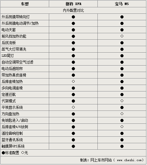 既然提到兩款車均為豪華車型,舒適配置當(dāng)然也是不能被忽視的一面。捷豹XFR則在此方面表現(xiàn)的可圈可點(diǎn),多項(xiàng)高端配置均一一齊備。而價(jià)格相差3萬的寶馬M5在此方面則略顯遜色,看來寶馬車型更加在乎駕駛樂趣。但從此方面則證明了捷豹XFR為有機(jī)會乘坐其中的駕乘者想的更多,不僅滿足了駕駛與運(yùn)動(dòng)的樂趣,也可直接享受更多的舒適及便利。
