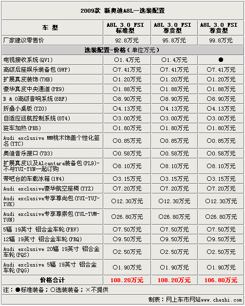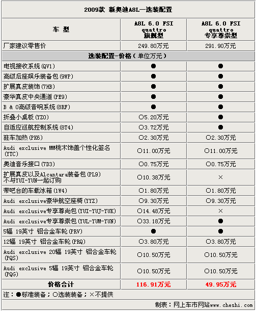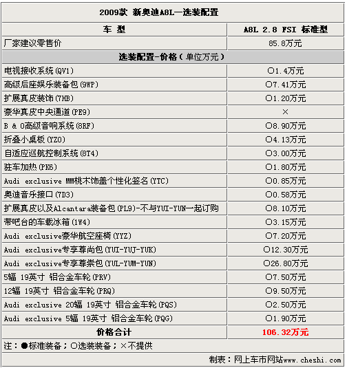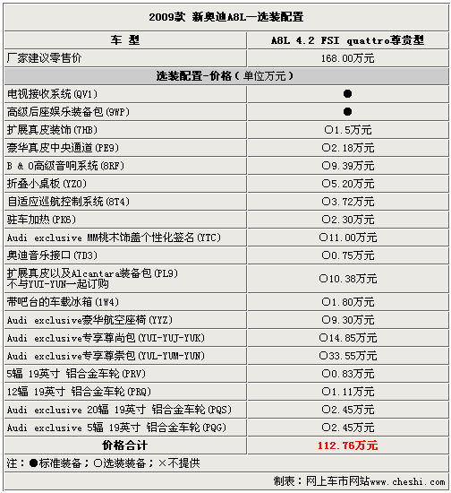 以上的選裝配置需要在預(yù)訂車輛前選擇好,經(jīng)銷商會(huì)根據(jù)客戶的訂單向廠家發(fā)送配置代碼。09款?yuàn)W迪A8L的選裝配置十分豐富,完全可以滿足對(duì)配置有需求消費(fèi)者的“苛刻”要求。當(dāng)然,這些配置也需要不菲的金錢才可以擁有,究竟哪些配置適合有品位懂得享受的您呢?