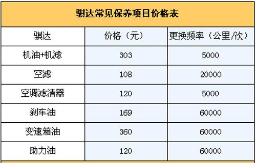 4.保養(yǎng)費(fèi):我們向東風(fēng)日產(chǎn)4S店售后服務(wù)人員咨詢(xún)過(guò),騏達(dá)常規(guī)保養(yǎng)周期定為每5000公里一次,首保在購(gòu)車(chē)后行駛1000km或一個(gè)月進(jìn)行(以先達(dá)到者為限),二保5000公里時(shí)進(jìn)行,前兩次保養(yǎng)免費(fèi)。假設(shè)一年跑2萬(wàn)公里,則需要做保養(yǎng)四次。前三次都為常規(guī)保養(yǎng)(只更換機(jī)油機(jī)濾),一次303元、一次379元交替進(jìn)行。第四次保養(yǎng)(更換機(jī)油機(jī)濾+空濾+空調(diào)濾芯)為637元;如此一個(gè)周期往復(fù)。另外4萬(wàn)公里保養(yǎng)時(shí)需要更換剎車(chē)油和變速箱油,保養(yǎng)價(jià)格為1090元,那么2年/4萬(wàn)公里總費(fèi)用大概需要3318元左右,平均一年為1659元。