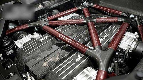 打開背部的引擎蓋,可以發(fā)現(xiàn)一個(gè)印有DMC字樣的紅色碳纖加強(qiáng)架,在加強(qiáng)架下的V12引擎經(jīng)過重新DMC的ECU刷寫后,馬力提升至670匹的水平。經(jīng)過測(cè)速,這臺(tái)Quattro Veloce在0-96的加速時(shí)間只需3.2秒,可見Murcielago強(qiáng)大的改裝潛力。
