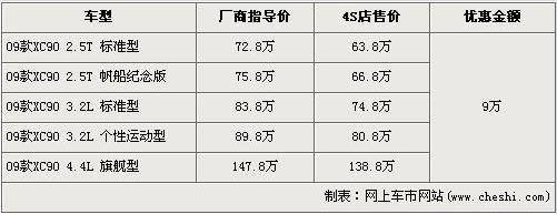 沃爾沃XC90是沃爾沃XC系列車型中的頂級產(chǎn)品,是沃爾沃汽車公司在全球推出的首款全時四輪驅(qū)動的SUV車型,同時也是沃爾沃首款進(jìn)入中國市場的SUV車型。近日據(jù)網(wǎng)上車市價格數(shù)據(jù)監(jiān)測顯示,09款沃爾沃XC90全系現(xiàn)金優(yōu)惠9萬元,具體詳情請看下表: