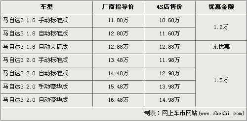 長安馬自達旗下主力車型馬自達3以1.6L車型于06年開場,隨后又為車系注入了2.0L車型,2年時間馬3憑借動感的外觀以及優(yōu)越的性能博得了消費者的喜愛。今年的4月2日長安馬自達又為消費者帶來了1.6L的自動天窗版車型,豐富了馬3的銷售車型。據(jù)了解,近期購買馬自達3的消費者可以得到最高1.5萬元的優(yōu)惠,具體詳情請看下表: