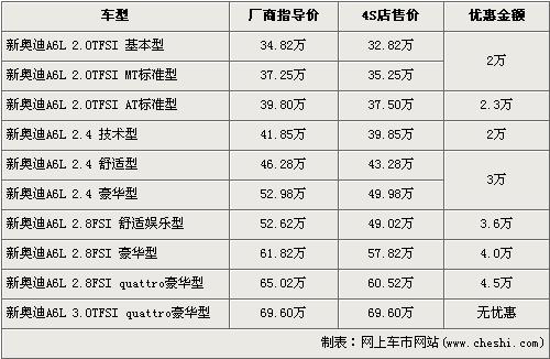 據(jù)4S店銷售人員介紹,目前奧迪A6L全系可以最高優(yōu)惠4.5萬元。奧迪A6L全系分為2.0TFSI,2.4L,2.8FSI,3.0TFSI四種共10個(gè)車型,最低配的2.0TFSI基本型經(jīng)2萬元優(yōu)惠后售價(jià)從34.82萬元下降到了32.82萬元,而2.8TSI quattro豪華版經(jīng)全系最高的4.5萬元優(yōu)惠后售價(jià)也降到了60.52萬元。全系最高配的3.0TFSI quattro豪華版目前店內(nèi)沒有現(xiàn)車,欲購(gòu)買的消費(fèi)者需要交1萬元訂金,約等3個(gè)月后方可提車。