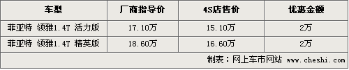 作為一款三廂緊湊型轎車,領(lǐng)雅搭載了一款1.4T渦輪增壓發(fā)動(dòng)機(jī),在同級(jí)車中較為少見。雖然菲亞特系列新車保有量比較少,但仍有眾多消費(fèi)者關(guān)注目前的車型。根據(jù)網(wǎng)上車市價(jià)格監(jiān)測(cè)系統(tǒng)顯示,目前菲亞特領(lǐng)雅雖然有2萬(wàn)左右的優(yōu)惠,但店內(nèi)現(xiàn)車比較緊張,具體行情如下: