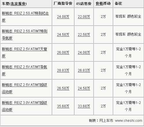 據(jù)北京一汽豐田4S店銷售人員介紹,目前銳志全系優(yōu)惠2萬元,銳志 REIZ 2.5S AT特別紀(jì)念和2.5S AT/MT特別導(dǎo)航版有現(xiàn)車供應(yīng),且顏色較全,其余高配車型均需要預(yù)定。銷售人員還表示:現(xiàn)車的顏色有銀、白、黑、紅可供選擇,有現(xiàn)車的這兩款車型是豐田銳志賣的最火的也是性價比最高的兩款車型。消費者交定金1萬等待1-2個月便可提車。北京地區(qū)各4S店由于訂單不同,各店銷售的現(xiàn)車顏色有所不同。
