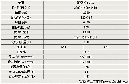 今年下半年將在長(zhǎng)安鈴木投產(chǎn)的新奧拓,長(zhǎng)寬高分別達(dá)到3500/1600/1470毫米,軸距也達(dá)到了2360毫米,與長(zhǎng)安奔奔等車型同一級(jí)別。作為一款微型轎車,新奧拓的風(fēng)阻系數(shù)達(dá)到了0.3,再加上855kg的整備質(zhì)量,對(duì)整車的動(dòng)力性能有很大幫助。