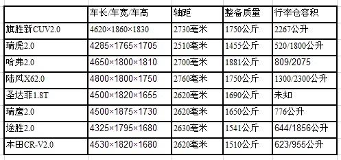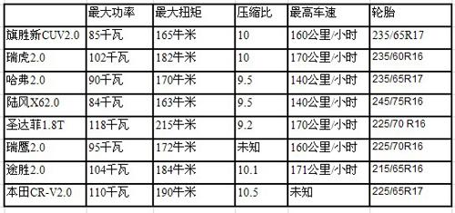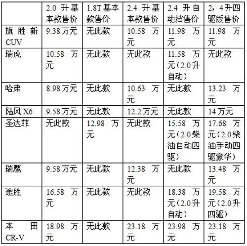 我們從廠家了解到,新旗勝已經全面上市,動力分為2.0升和2.4升兩個系列,分為兩驅和四驅共6個車型。外形看,這是一款頗為漂亮的車子,外形、做工和配置,與其售價很是不符。為了讓大家對其有所了解,這里把新旗勝和同級的幾款自主品牌SUV以及小一個級的SUV(比如瑞虎)做一番簡單對比。為了參考的更全面,還把包括本田CR-V在內的幾款合資車同時排列,盡管它們所面對的,并非同一個市場,特別是像本田這樣的車型,與自主品牌相比,品牌價值差異較大,不能做直接對比,只能是個參考。