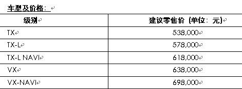 作為舊款VX級別車型的延續(xù),TX-L級別配置更加豐富,采用4.0L雙VVT-i的發(fā)動機,性能大幅提升。除沿用了舊款VX級別所配備的主動牽引力控制系統(tǒng)A-TRC以及車輛穩(wěn)定控制系統(tǒng)VSC外,還增加了第三排座椅電動折疊功能、智能鑰匙及一鍵啟動系統(tǒng)、自發(fā)光式儀表盤等,同時,SRS空氣囊也增至7個。在這種配置下,TX-L級別的價格設(shè)定為57.8萬元,比舊款VX級別的價格還低7千元。