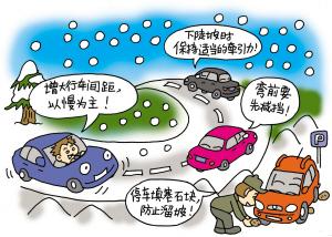 對于雪地的駕駛技巧,交警部門提醒車主,關(guān)鍵是以“慢”為主,并與前車保持足夠的剎車距離。然而,路況的復(fù)雜,讓很多駕駛員在發(fā)生側(cè)滑時感到緊張!叭绻囕v打滑,方向盤要順著打滑方向輕輕地轉(zhuǎn),待車輪回正后,再輕輕地踩剎車。”“關(guān)鍵是要慢,平穩(wěn)地減速及輕踩剎車,絕對不要在冰雪濕滑的路面上猛起步,或緊急剎車。”杭城資深出租車司機(jī)師傅們紛紛提供雨雪天氣駕駛竅門。