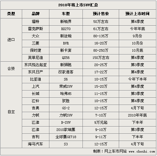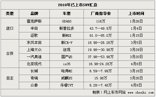從年初至今,已經(jīng)上市的SUV車型達(dá)到了10款之多,而3月上市的就占到5款。其中上海大眾途觀在上市預(yù)售首月訂單就突破了4萬輛的;隨后上市的國產(chǎn)奧迪Q5訂單已經(jīng)排到明年,目前購買這兩款車仍需要加2.5萬-3萬元才能提到現(xiàn)車。而4月8日上市的iX35則又將在日系車市場(chǎng)掀起一股搶購熱潮。