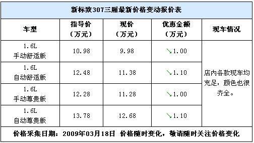 近日,筆者走訪北京雙龍雅致東風(fēng)標(biāo)致4S店時(shí)了解到,目前店內(nèi)的307三廂1.6L車型優(yōu)惠有所加大,目前手動(dòng)擋車型可以優(yōu)惠1萬元,自動(dòng)擋車型可以優(yōu)惠1.1萬元,店內(nèi)現(xiàn)車充足,顏色也很齊全,詳細(xì)價(jià)格信息請(qǐng)見下表: