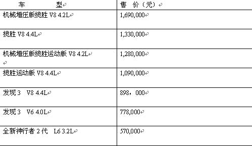 中新網(wǎng)11月8日電 近日,記者獲悉,路虎主力產(chǎn)品08款攬勝運動版正式登陸北京、華北、西北、西南市場,其中4.4升V8汽油自然進(jìn)氣版價格為109萬元,4.2升V8機械增壓版價格為128萬元。經(jīng)銷商處現(xiàn)已接受預(yù)訂,訂金為5萬元。