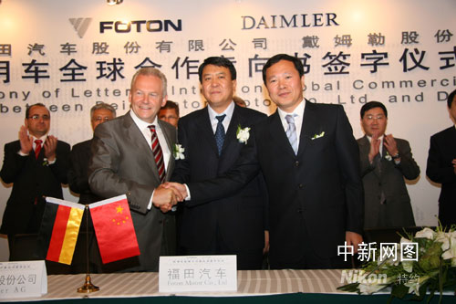 左起:戴姆勒董事顧儒伯、北汽控股董事長徐和誼、福田總經(jīng)理王金玉