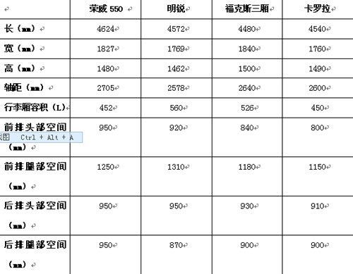 從數(shù)字上看,?怂谷龓能噹麑挾茸畲,高度也不錯(cuò),屬于“高寬短形”;卡羅拉的車廂長度和高度都有最佳表現(xiàn),但寬度卻是倒數(shù)第一,屬于“高瘦長形”。軸距、車長都是4者最長的榮威550則已占據(jù)中級車尺寸極限;而明銳的尺寸則比較中庸,屬于比上不足,比下有余的一族。