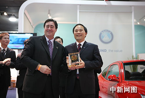 中新網(wǎng)1月16日電 當(dāng)?shù)貢r(shí)間1月14日下午,2008底特律車展組委會(huì)主席卡爾•加里亞拉來到吉利展臺(tái),將本次展會(huì)一份非常特殊的大獎(jiǎng)授予吉利集團(tuán)董事長(zhǎng)李書福,表彰他多年來領(lǐng)導(dǎo)吉利汽車不斷進(jìn)取、不斷進(jìn)步所取得的非凡成就。