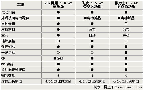 標(biāo)致207、新飛度和雅力士雖然作為緊湊型A0級(jí)轎車,但是在舒適配置方面卻完全不輸給中高級(jí)轎車。雅力士配備了中高級(jí)轎車才配備的一鍵啟動(dòng)按鍵,使得整車檔次有所提升。而新飛度則更是厲害在配備了自動(dòng)空調(diào)的同時(shí),還配備了高級(jí)轎車上才可以見(jiàn)到的撥片換檔器,使得該車更加具備了運(yùn)動(dòng)氣息。標(biāo)致207配備帶有MP3功能多碟CD音響系統(tǒng),并且同時(shí)都具備多功能音響接口。讓人頗感遺憾,雅力士高配車型沒(méi)有配備電動(dòng)天窗。