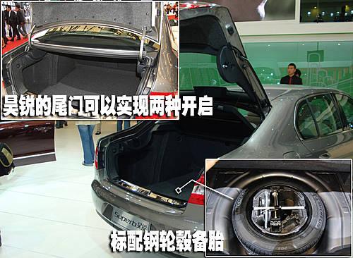 斯柯達(dá)昊銳的行李箱有兩種開(kāi)啟方式,一種是像普通轎車(chē)一樣的僅代開(kāi)行李箱蓋,另一種是完全將行李箱蓋連同后風(fēng)擋玻璃打開(kāi)(與明銳相同)的掀背式打開(kāi)方式,這項(xiàng)配置在同級(jí)別車(chē)型中絕無(wú)僅有,其造價(jià)也要大大高于普通車(chē)型。斯柯達(dá)昊銳的備胎也是普通的鋼輪轂。