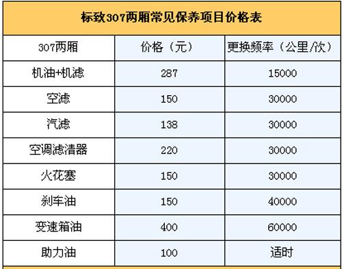 5.保養(yǎng)費: 我們向標(biāo)致4S店售后服務(wù)人員咨詢過,他們說307一大優(yōu)勢是保養(yǎng)周期比較長,1.5萬公里才需要保養(yǎng)一次,是同級車型中保養(yǎng)花費最低的。通常新車首保在7500公里時進(jìn)行,以后每1.5公里保養(yǎng)一次。第二次1.5萬公里時的常規(guī)保養(yǎng)(更換機油機濾)需花費287元;3萬公里保養(yǎng)(更換機油機濾+空濾+空調(diào)濾芯+汽濾+火花塞)為795元;4.5萬公里保養(yǎng)(更換機油機濾)花費287元;6萬公里保養(yǎng)(更換機油機濾+空濾+空調(diào)濾芯+汽濾+火花塞)為795元。