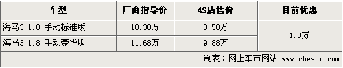 海馬系列車型一直有經(jīng)濟(jì)、省油等鮮明的特點(diǎn)。而在海馬3等一批車型上,則融合了更多時(shí)尚和運(yùn)動(dòng)的元素,同時(shí)全車在設(shè)計(jì)、配置以及燃油性上均有提升。根據(jù)網(wǎng)上車市價(jià)格監(jiān)測系統(tǒng)顯示,目前海馬3在售的兩款車型最高優(yōu)惠達(dá)到了1.8萬元,具體車型以及價(jià)格如下: