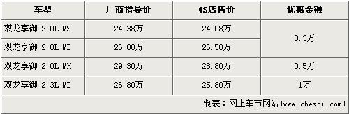 憑越野車起家的雙龍,向來是以生產(chǎn)SUV而著稱的,旗下的雙龍享御更是其的代表之作,其2.0L車型搭載的柴油發(fā)動機(jī)更是源于奔馳的技術(shù)。雙龍享御共有四款車型,售價區(qū)間為24.38萬元-29.30萬元。近日根據(jù)網(wǎng)上車市價格監(jiān)測顯示,雙龍享御全系最高優(yōu)惠1萬元,詳情請看下表:
