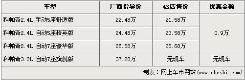 科帕奇車型分為2.4L與3.2L兩種排量,2.4L手動五座舒適版和2.4L七座手自一體豪華版兩款車型先期上市,2.4L 5座精英版和3.2L排量的車型隨后也上市銷售,全車系售價區(qū)間為22.48萬元-37.28萬元。近期根據(jù)網(wǎng)上車市價格監(jiān)測顯示,科帕奇2.4L車型全系優(yōu)惠9000元,具體詳情請看下表: