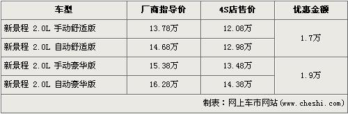 根據(jù)經(jīng)銷商處銷售人員介紹,“大嘴”新景程2.0L舒適版現(xiàn)金優(yōu)惠從1.9萬元下降到了1.7萬元,豪華版車型優(yōu)惠也從2萬元小幅下降到了1.9萬元。經(jīng)優(yōu)惠后,舒適版的手動與自動車型售價分別回升了12.08萬元及12.98萬元,豪華版車型的手動與自動車型售價也漲到了13.48萬元和14.38萬元。銷售人員還表示,目前店內現(xiàn)車充足,顏色也全,消費者自由挑選的空間變得更加便利,更加自由。