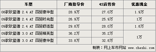 歐藍(lán)德是三菱引入國(guó)內(nèi)銷(xiāo)售的中型SUV車(chē)型,經(jīng)過(guò)09款小改款后,新款在外觀上增加了冷銀色換擋裝飾板,鍍鉻門(mén)內(nèi)把手,鍍鉻側(cè)窗裝飾物,鍍鉻尾門(mén)裝飾條等等,同時(shí)內(nèi)飾也有局部的變動(dòng)和提升。根據(jù)網(wǎng)上車(chē)市價(jià)格監(jiān)測(cè)系統(tǒng)顯示,目前歐藍(lán)德新老款車(chē)的優(yōu)惠幅度均在2萬(wàn)元內(nèi),具體車(chē)型以及價(jià)格如下: