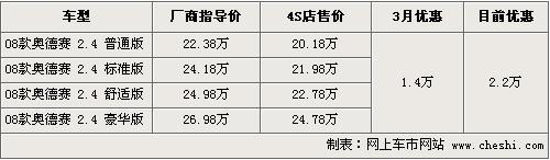 據(jù)北京地區(qū)廣州本田4S點(diǎn)銷售人員表示,目前銷售的08款?yuàn)W德賽降幅又出現(xiàn)了新的優(yōu)惠幅度。3月份左右,奧德賽全系優(yōu)惠到了1.4萬(wàn)元,而目前增加到了2.2萬(wàn)元,直接增加8000元,最低價(jià)格僅售20.18萬(wàn)元,F(xiàn)在購(gòu)車除了可以得到現(xiàn)金優(yōu)惠外,還可以得到商家贈(zèng)送的原廠汽車裝飾。在現(xiàn)售的四款?yuàn)W德賽車型中,普通版座椅為絨布材質(zhì),其他三款均為真皮材質(zhì),現(xiàn)車多以黑色和銀色為主。